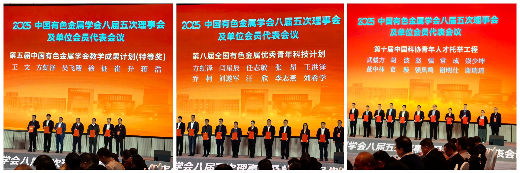 教师凭借突出的教学成果与科研实力斩获佳绩,王文教授荣获第五届全国有色金属学会教学成果特等奖,乔柯副教授入选第八届全国有色金属优秀青年科技计划,会议还表彰了第十届中国科协青年人才托举工程入选者强凤鸣等有色金属领域优秀青年人才。